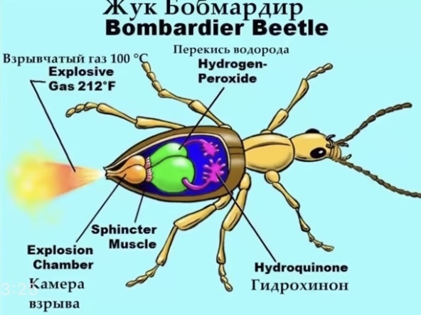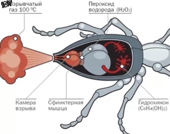При обнаружении опасности нервная система жука-бомбардира посылает импульсивные сигналы и в это время стенки большого резервуара начинают сжиматься. Все химические вещества переходят в камеру взрыва и происходят экзотермический реакции, которые высвобождают свободный кислород и вызывают нагревание этой жидкости до 100 градусов. Затем, вся эта страшная смесь за какие то сотые доли секунды окутывает врага, при этом это не один выстрел, а целая очередь залпов с необычной скоростью - более 400 раз в секунду.