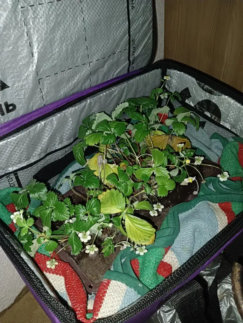 Честно говоря, не ожидали мы, что настолько комфортно ей в термосумке! Земляника цвела и не собиралась отдыхать до весны.