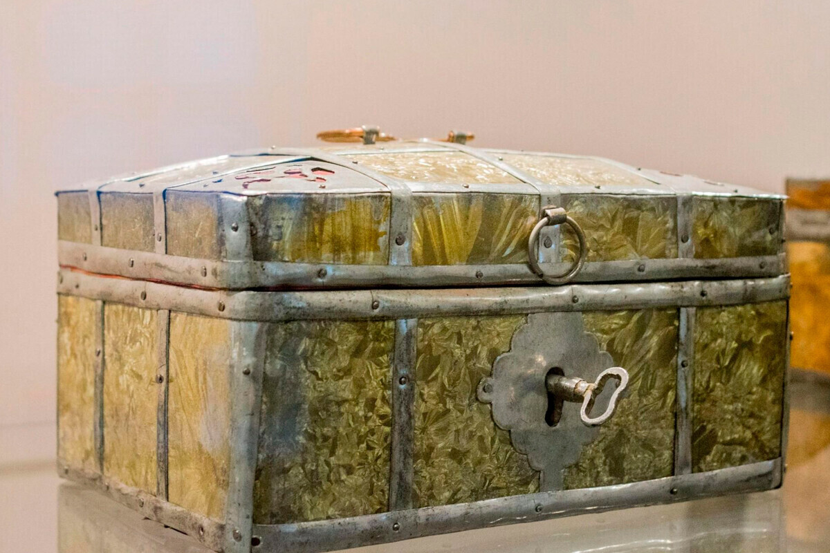 Жестяные шкатулки с нежным “морозным” мерцающим рисунком - уникальное изделие из города Великий Устюг Вологодской области. Рисунок наносится на тонкий лист жести путем химической обработки, а затем шкатулка украшается железными накладками. Это ремесло существовало с 18 века и практически до конца 20 века. Устюжские мастера возили свои шкатулки на ярмарки и продавали их восточным купцам. Однако технология “инея на олове” в настоящее время утрачена. Последним мастером был Борис Холмогоров, который в 1970-х и 1980-х годах сам разгадал секрет ремесла и наладил производство шкатулок на местной фабрике. Его “морозные шкатулки” были приобретены музеями Москвы, Вологды, Суздаля и Великого Устюга. К сожалению, у него не было учеников.