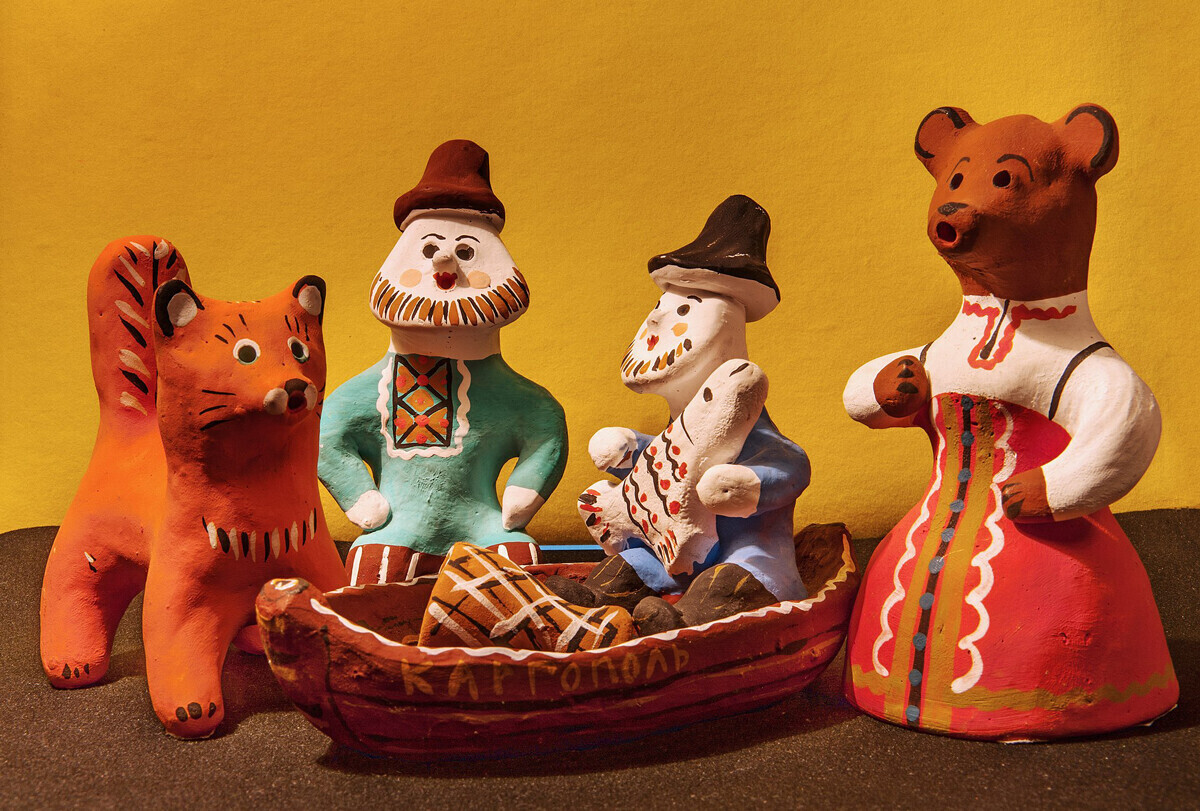 Старинный русский город Каргополь в Архангельской области является родиной расписных глиняных игрушек. Все дело в местной красной глине. На протяжении веков мастера изготавливали из нее посуду, которую продавали на ярмарках, а из остатков глины делали забавные фигурки людей и животных. После выпечки в духовке фигурки помещают в специальный раствор на основе муки, который оставляет кружевной узор, придающий этим игрушкам сходство с изделиями каменного века. Они до сих пор производятся в Каргополе и являются очень популярными сувенирами.