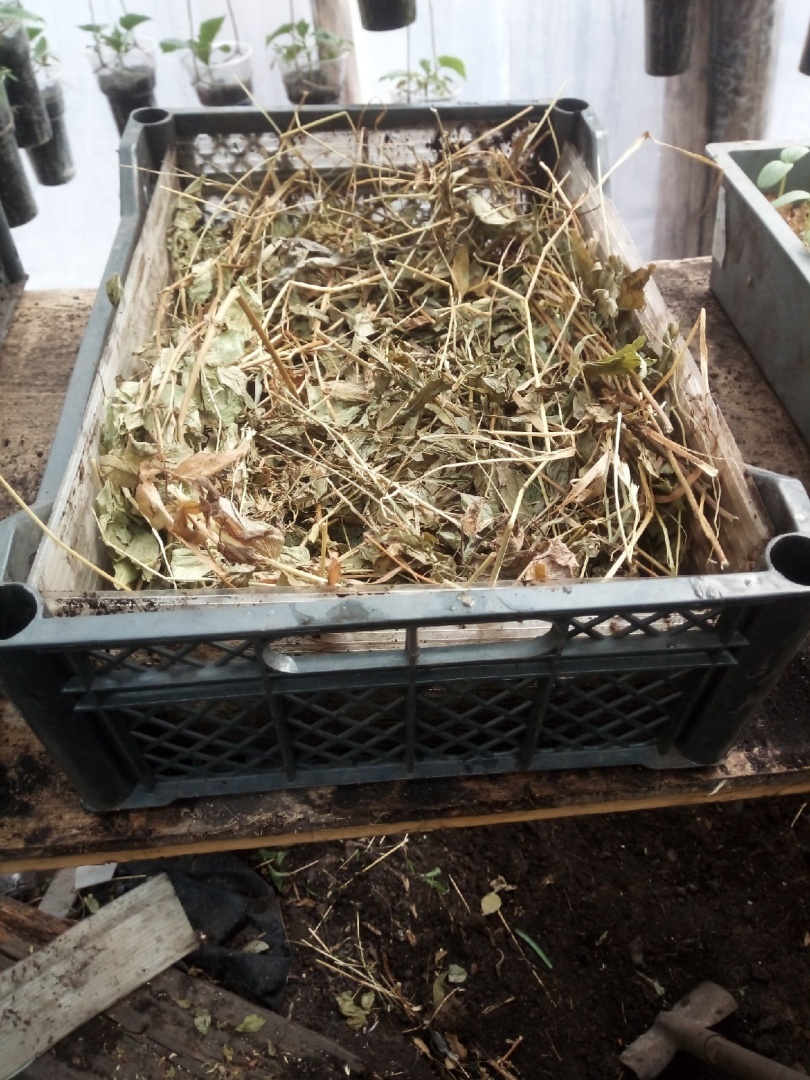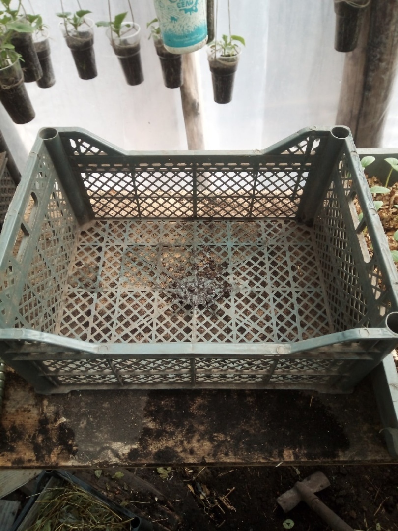 Пересаживаю в товарный пластмассовый ящик. На дно ящика и немного по краям выкладываю сено, можно солому. По бокам вставлю пластины вырезанные из поликарбоната, чтобы при поливе вода не вымывала землю из ящика. Затем засыпаю подготовленный грунт и высаживаю туда огурцы.