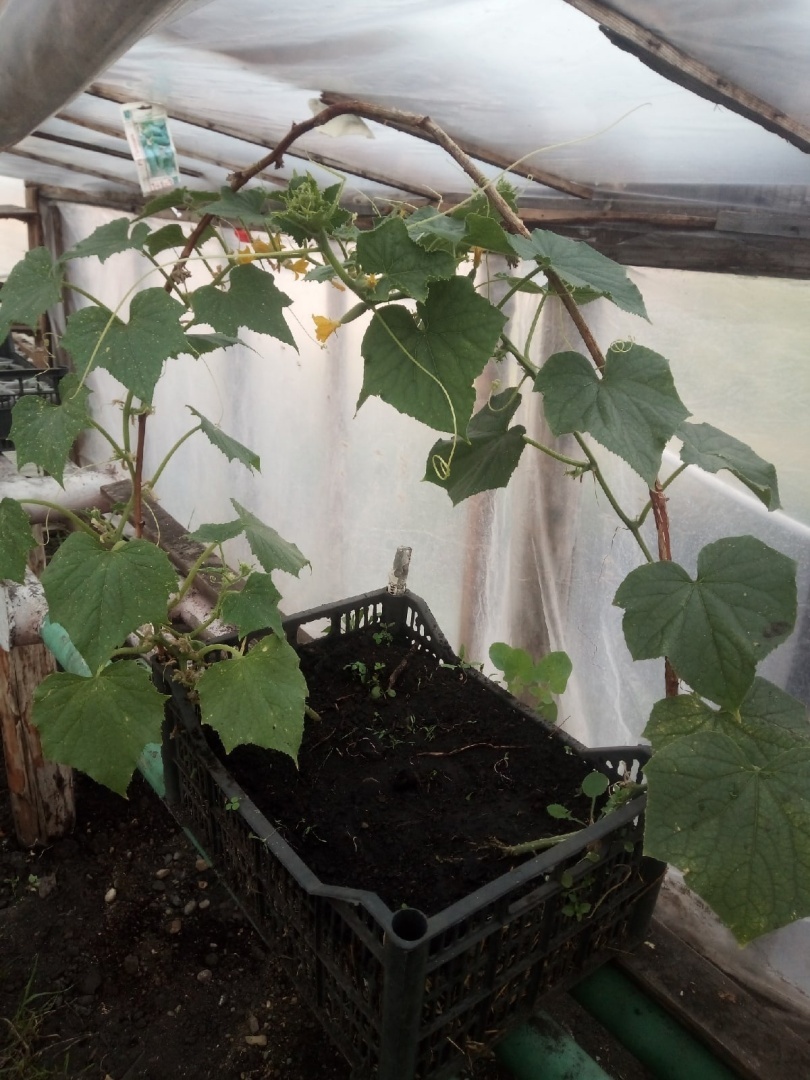 В таком ящике огурец спокойно может плодоносить до первого десятка огурцов.
