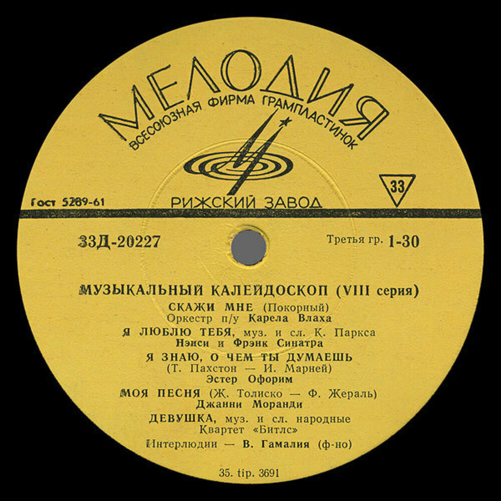 На пластинке было написано «ДЕВУШКА», кватрет «Битлс». Поскольку имена участников группы находились под запретом «советского худсовета», было написано «Музыка и слова народные».