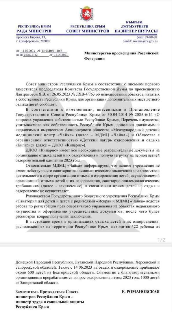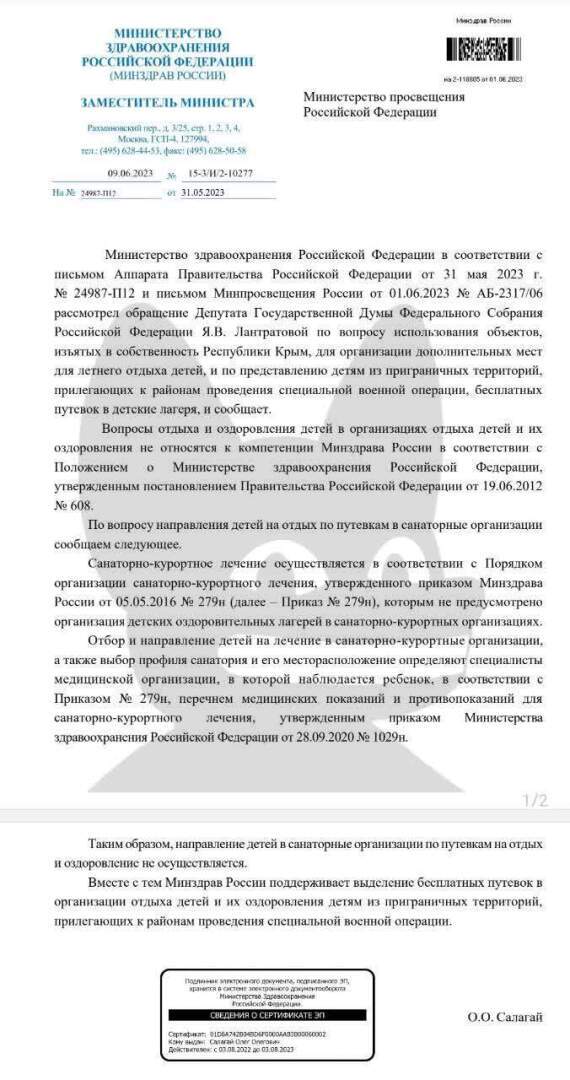 Депутат Госдумы Яна Лантратова сообщила Осторожно Media, что получила ответ из правительства на своё обращение к премьеру Мишустину, в котором просила расширить перечень объектов, определённых для организации летнего детского отдыха, за счёт объектов, изъятых в собственность Республики Крым.