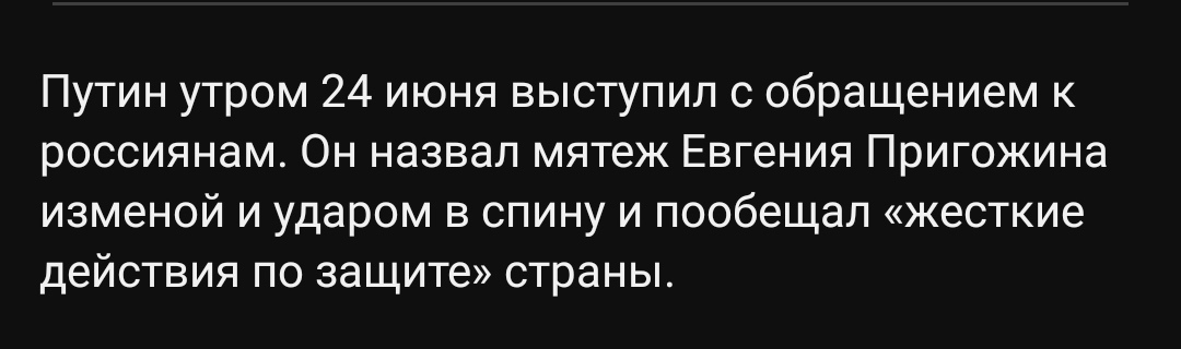 Пишут что причиной явился ракетный удар ВС РФ по ЧВК "Вагнер". Много погибших. Правда? Так может есть смысл урегулировать конфликт и наказать настоящих виновных. Виновных в плохом обеспечении, виновных в разжигании конфликта. А какие требования Пригожина? А может они справедливы? Ведь он сам хоронил своих ребят. А кто из высшего состава МО присутствовал на похоронах солдат? Или лично написал похоронку матери?