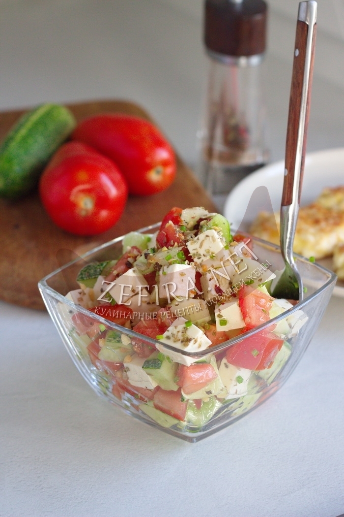Переложите нарезанные овощи и сыр в большую салатницу или глубокую миску. Посолите и поперчите по вкусу. Не переборщите со специями, чтобы сохранить свежий и натуральный вкус салата.