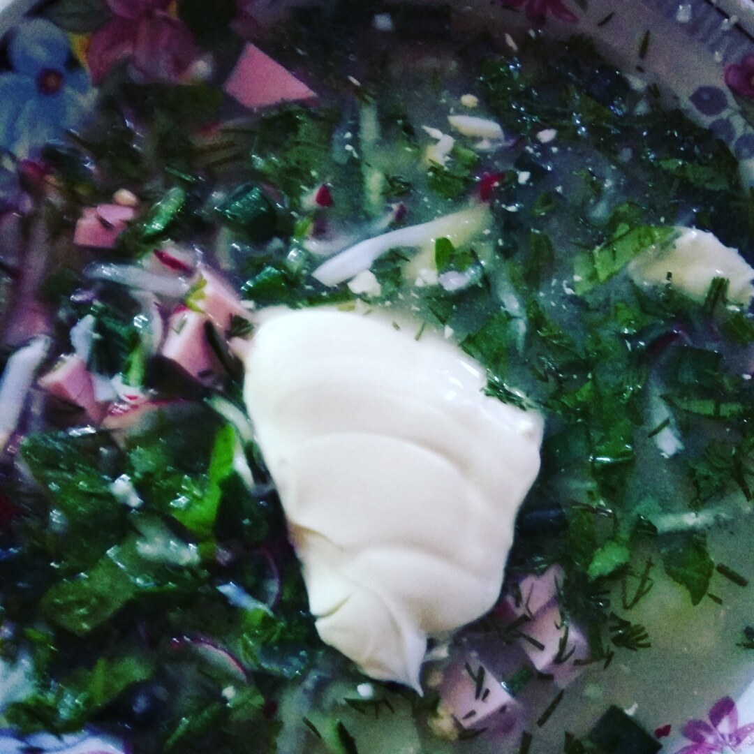 Зелень вымыть, встряхнуть от воды и также мелко нарезать.