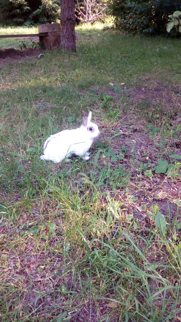 Только мы разнежились на солнышке, как из-за куста на нас выскочил - белый кролик. Сначала приняли его за собаку: так нагло он промчался по нашей подстилке, разлил сок и воду, расшвырял бутерброды!