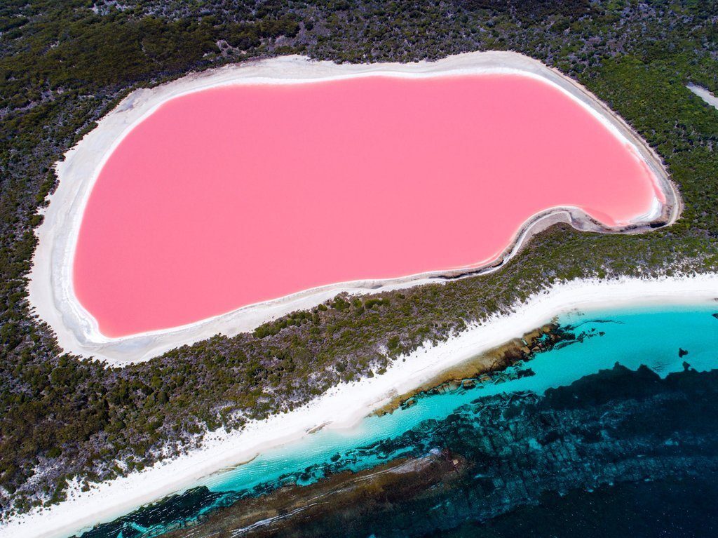Сверху сверкающая, бледно-розовая гладь далекого озера Хиллер выглядит как вишенка на продолговатом торте. Соленое озеро шириной около 600 м расположено на одном из углов Среднего острова. Озеро, окруженное белой солью и темно-зелеными эвкалиптами, отделено от океана узкими белыми дюнами и слоями песка. Странный цвет озера был изучен группой ученых в 1950 году, которые ожидали найти водоросли в соленой воде. В воде с высокой соленостью некоторые водоросли производят красители, которые объясняют цвет других розовых прудов в Австралии. Однако пробы воды из озера Хиллер не содержали никаких признаков появления каких-либо водорослей, поэтому причина появления воды в озере до сих пор остается тайной.