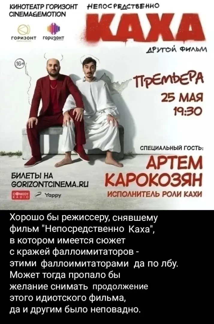 Прочитав содержание о фильме Виктора Шамирова "Непосредственно Каха", который два года назад шел в кинотеатрах нашей страны, мне пришлось с негодованием в компаниии высказаться об этом фильме, где сюжет связан с кражей фаллоимитаторов и о продолжении этого фильма, находящемся с мая 2023 года уже в сегодняшнее время в кинопрокате . Режиссёр назвал второй свой фильм "Непосредственно Каха. Продолжение". Сюжет другого фильма закручен на том, что девушка была изнасилована, пьяная спящая в машине и она оказалась дочерью криминального авторитета. Вот такие бредовые фильмы идут в кинотеатрах нашей страны.