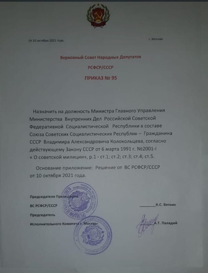 переименовали, потому, что в корпорации, нет милиции. Корпорация РФ оформлена в Британии, там полиция, полиция не служит народу, она служил олигархам. Милиция служит народу! Вот прочитайте этот приказ, который подтверждает, что мы на данный момент живем в СССР/РСФСР. Мы в окупации
