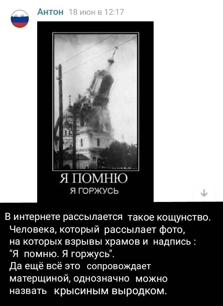 Прислал Игнатов в сообщество и фото с надписью "Я помню. Я горжусь" как рушится от взрыва православный храм. Вот такая мерзость пытается укусить сообщество "За речь без мата и песню Русскую", но получилось по-другому об этой крысе узнали тысячи людей, а группа продолжает набирать силу и мощь.