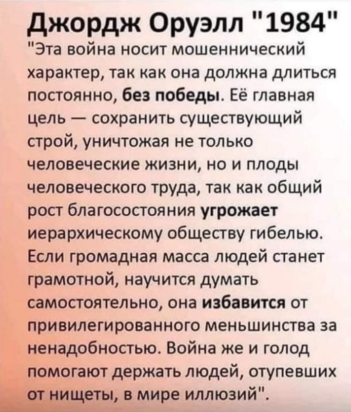 А я все больше убеждаюсь, что не с западом, а за истребление человеческой массы в условиях глобального потепления. И куча предприятий в Европе встала, не все конечно, но многие. А финка только в НАТО вступила, пиндосы уже Арктику осваивают, ожидается что через 15 лет глобального потепления Арктические моря будут судоходными. Представляете, Россия и Украина будут с субтропическим климатом? Наши земли тоже завидные, и недра и по климату теперь. А кремлядь неспроста вывозит бабло в Англию и пиндосам, это война олигархов с простым народом. И мигрантов в Европу 10+млн понагнали за последние 10 лет неспроста. Они в гетто , считай в тюрьме, устали жить и с радостью наемниками за копейки идут в ВСУ сейчас. Может и Россия для этих целей сбор мигрантов устроила. Только в Европы плыли одни мужики молодые здоровые, женщин с детьми немного. А в России иммиграция семей из азиатских республик.