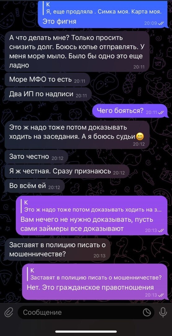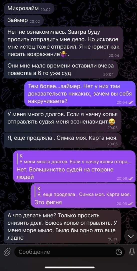 Клиент просит юриста составить возражение по данному делу, юрист просит прислать материалы дела для ознакомления. Далее завязывается переписка просто фантастическая. Юрист говорит я помогу у них нет доказательств. Клиент: У меня много долгов. (Ну понятно, время сейчас такое). Если я начну КОПЬЯ отправлять! ➶⤖ (что!? Копья в суд. Это какой же там долг? Как так довести можно?) Клиент: Судья меня возненавидит. (А, что Вы хотели? Создается вопрос. Копья суду.) Юрист успокаивает: Большинство судей на стороне людей. (После того как копья отправят, что-то не уверен, что суд вообще на какую-либо сторону вообще встанет). Клиент отвечает: А, что мне делать? Только просить снизить долг? Боюсь копье отправлять. (ну правильно и не надо, да как вообще такое в голову пришло, суду копье). У меня было море. (ЧТО!!! О чем речь вообще. Куда тогда тело море, за долги пришлось отдать?) Хорошо, клиент поправился, что море МФО. А, то напоминает какую-то древнегреческую тематику. Не удивился бы если бы там про коня Троянского что-то написали еще. Юрист спрашивает: Чего бояться? Клиент: Надо потом доказывать, ходить на заседания. А, судьи я боюсь. (Во-первых, не надо ходить так часто на заседания, главное составить правильное возражение. Во-вторых, чего бояться судьи)?