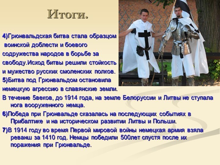 В конечном итоге, благодаря ловкости и тактическому мастерству, польско-литовский союз одержал победу над Тевтонским орденом. Около 15 тысяч рыцарей и наемников были убиты, а многие другие были взяты в плен. Польско-литовские потери также были значительными, но они смогли сохранить свою армию и занять стратегически важные позиции.