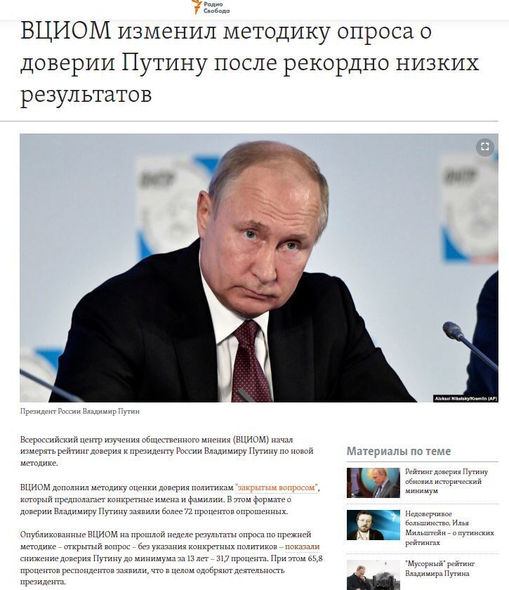 ВЦИОМ так ведёт себя из любви к правде и справедливости, или дело в другом?! И если в другом, то в чём?! Ни в том ли, что власти всё больше склоняются к выводу, что В. Путин им больше не нужен и он отработанный материал?! На мой взгляд, основания для такого предположения есть, и я его тоже уже высказывал.