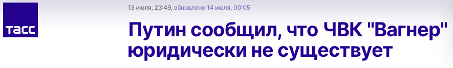 А несколько дней назад В. Путин нам всем сообщил, что ЧВК "Вагнер" юридически не существует. Как так? Как тогда можно было выделять деньги из бюджета тому, кого нет? Как может быть чирлА без яиц, а ядуга без сплетен?