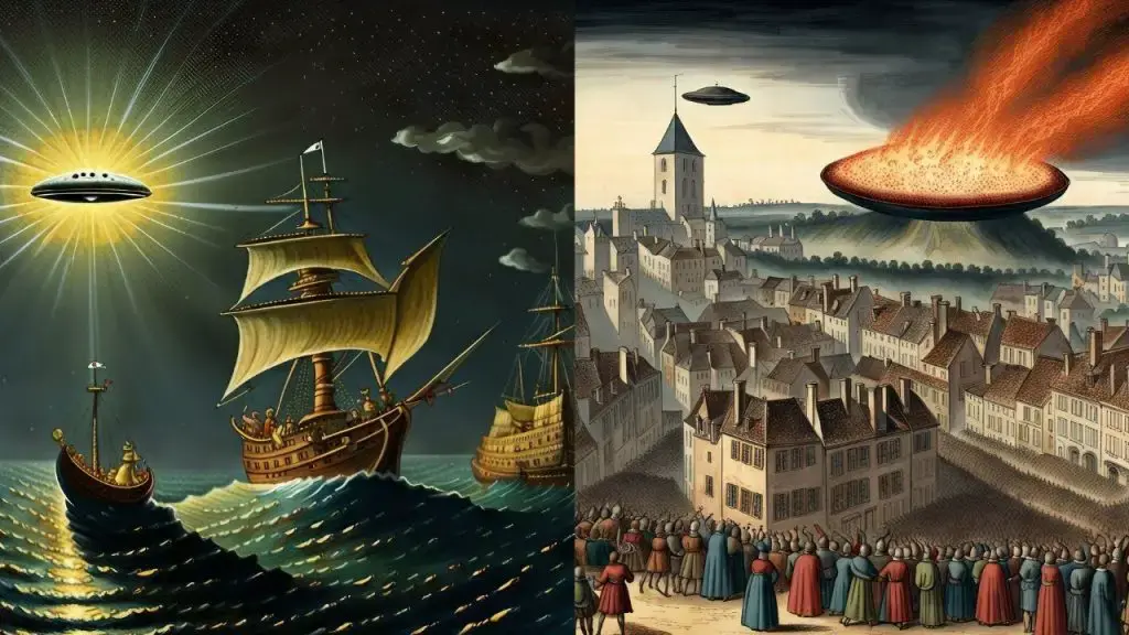 В 1523 году в Китае во время продолжительного дождя были замечены два корабля, на которых находились высокие мужчины в красных шапках и разноцветной одежде. Аналогичный случай произошел в 1526 году в Риме, где один из жителей утверждал, что его привезли люди-козлы на собрание ведьм. Эти рассказы еще больше разжигают огонь таинственности вокруг наблюдений НЛО в этот период.