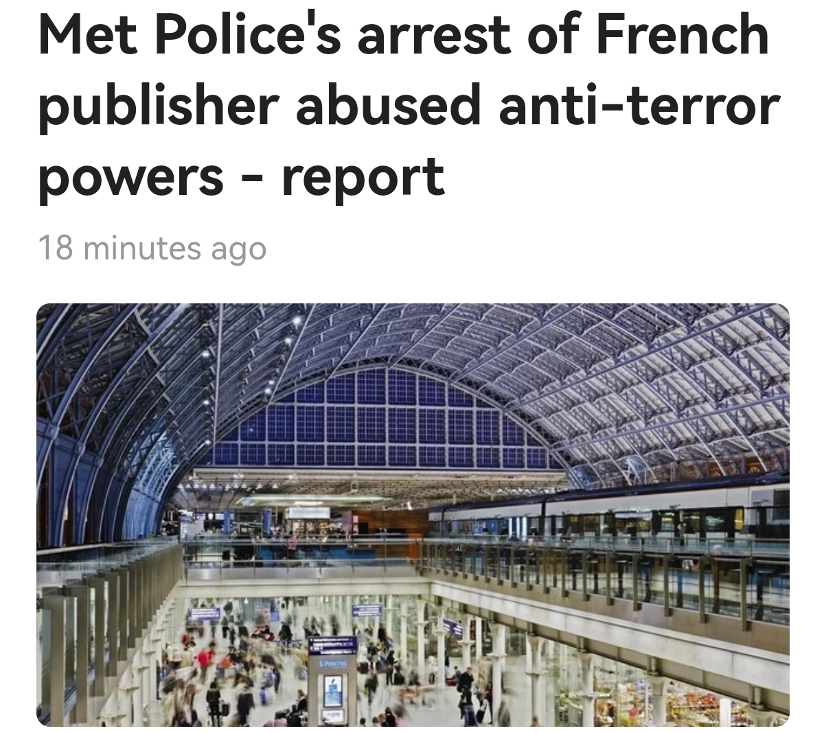 Согласно независимому отчету, полиция Метрополитена злоупотребила полномочиями по борьбе с терроризмом, когда остановила и арестовала французского издателя.