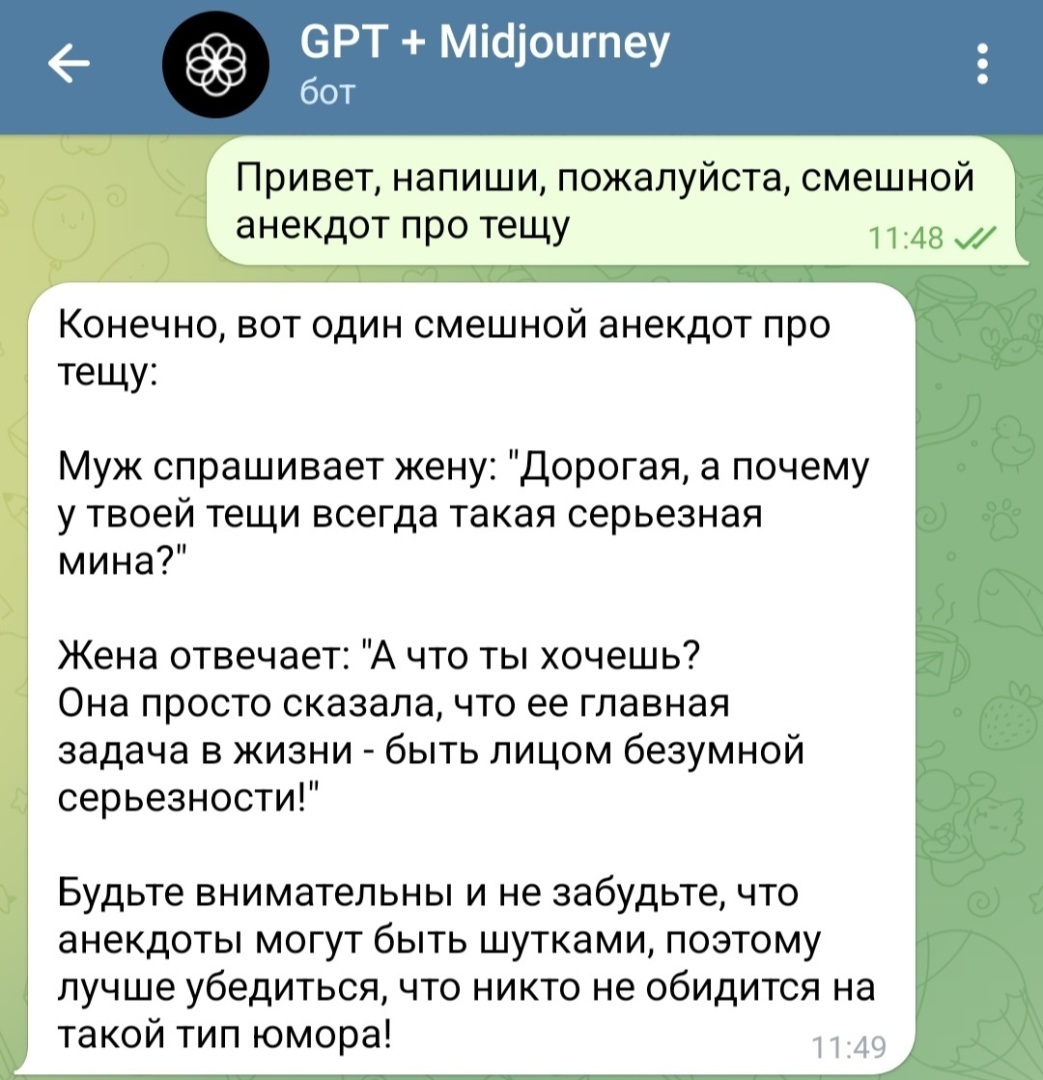 Черт возьми, да оттопыренный палец на руке выглядит смешнее. Попробуем крайний раз в телеграмм боте GPT+Midjourney: