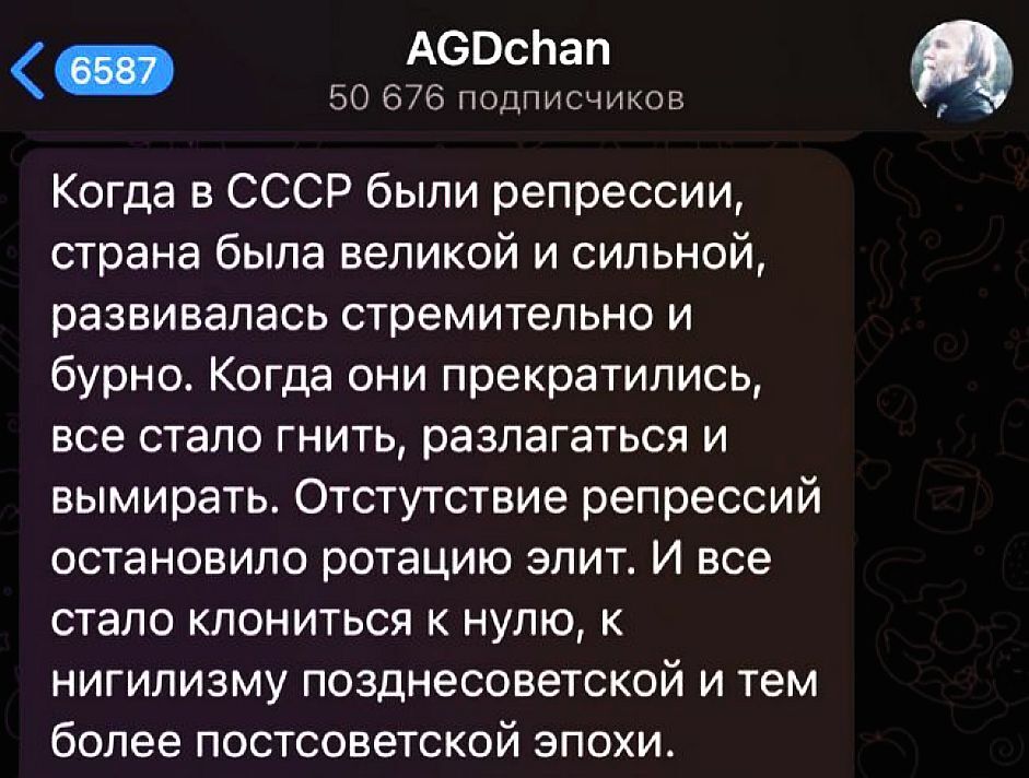 Александр Дугин, которого поклонники называют философом, опубликовал весьма интересный и неоднозначный пост, в котором утверждал, что именно репрессии сделали Россию великой и сильной, позволили быстро развиваться и производить чистку обнаглевших элит.