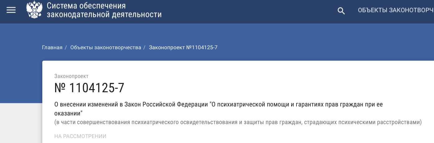 Законопроект № 1104125-7 касается оказания психиатрической помощи гражданам России, а также гарантий прав граждан РФ при лечении психиатрических заболеваний в психоневрологических интернатах (ПНИ).