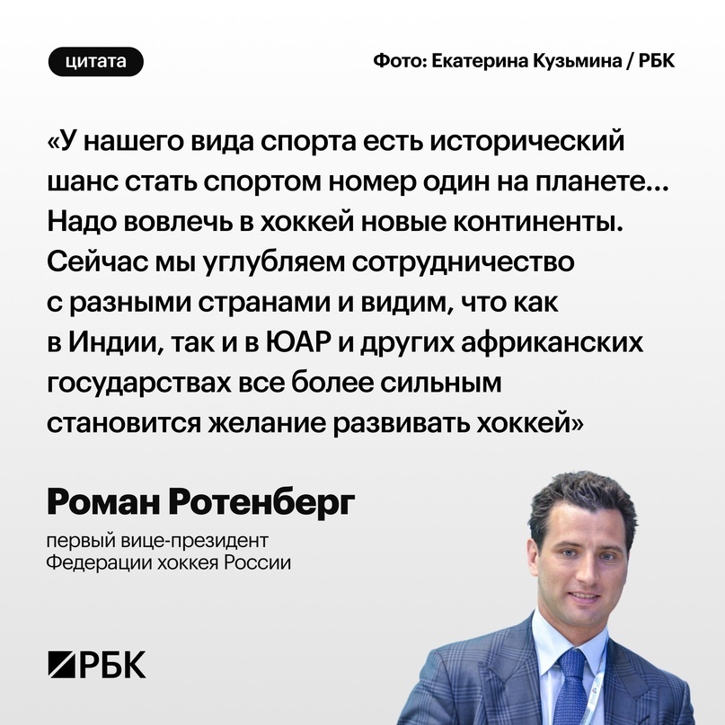 Первый вице-президент Федерации хоккея России (ФХР) и главный тренер петербургского СКА Роман Ротенберг заявил на форуме Россия — Африка, что Россия видит огромные возможности в развитии хоккея в Индии и Африке. Можно представить сколько миллиардов из Госбюджета РФ получат Ротенберги на эту геополитическую инициативу.