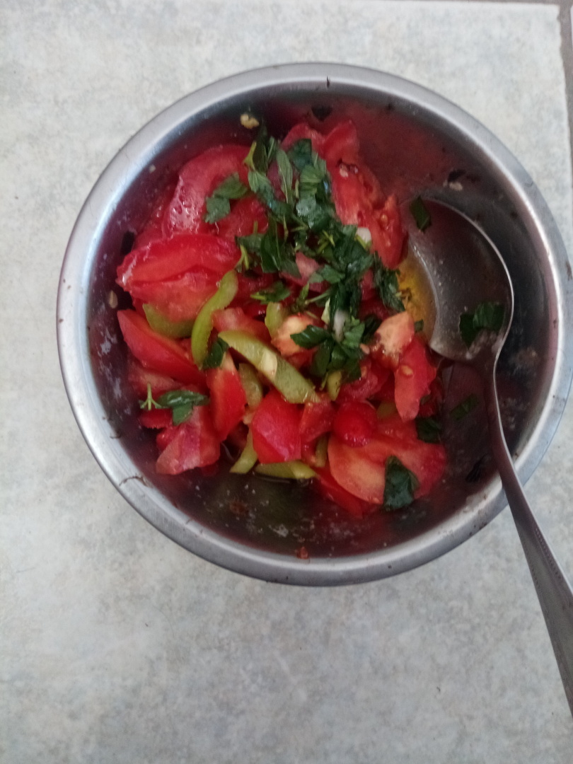 Продукты - качественные сладкие помидоры, болгарский перец, горький перец, чеснок, можно и лук репчатый, обязательно зелень перечной мяты, и заправка горчичным маслом или натуральной сметаной.