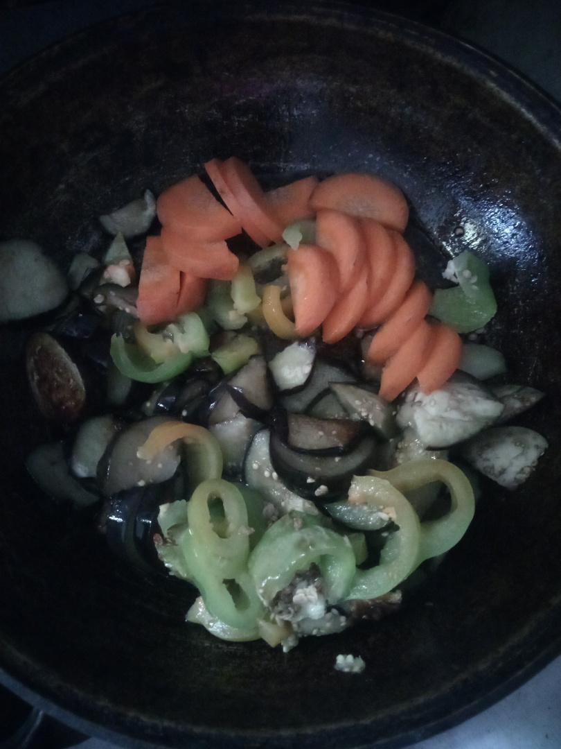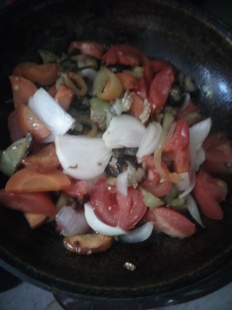 Сначала в сковороду опускаем большую часть баклажанов. Когда они слегка поджарится добавляем морковь, перец болгарский. Всё это перемешиваем, слегка пассирум и добавляем более нежные по структуре лук репчатый и мопидоры. Под крышкой всё слегка это томится и по вкусу солим.