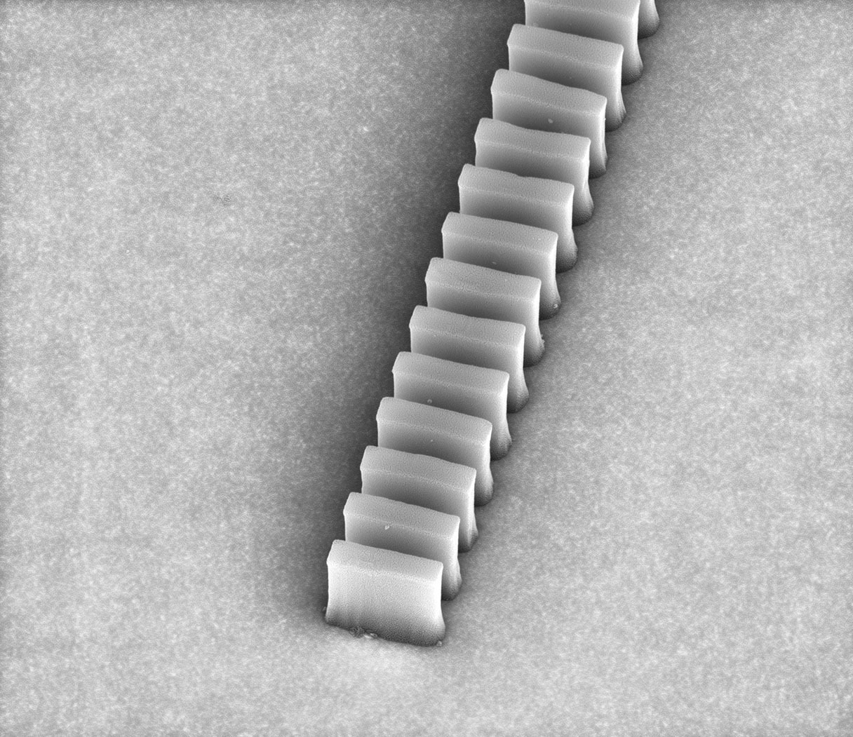 В надежде обойти эти проблемы Дионн и ее коллеги обратились к оптическому методу обнаружения, основанному на метаповерхностях, массивах крошечных кремниевых коробочек — каждая высотой примерно 500 нанометров, длиной 600 нанометров и шириной 160 нанометров, — которые фокусируют ближний инфракрасный свет на своей верхней поверхности. Такая фокусировка позволяет простому оптическому микроскопу легко обнаружить сдвиг длины волны света, исходящего от каждого кремниевого блока, который варьируется в зависимости от того, какие молекулы расположены сверху.