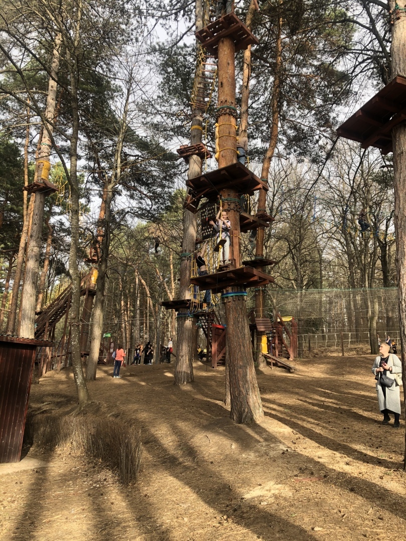 В настоящий момент там есть веревочный парк. Прогулки по парку очень разнообразные. Кто -то бегает, кто-то ходит с палками, катается на велосипеде, а кто-то просто гуляет как и мы. Очень много теренкуров, пешеходных дорожек и различных тропинок в парке, по всей территории, а она немаленькая – почти 1000 гектаров, растет более 250 видов деревьев, на которых живут 240 видов животных.