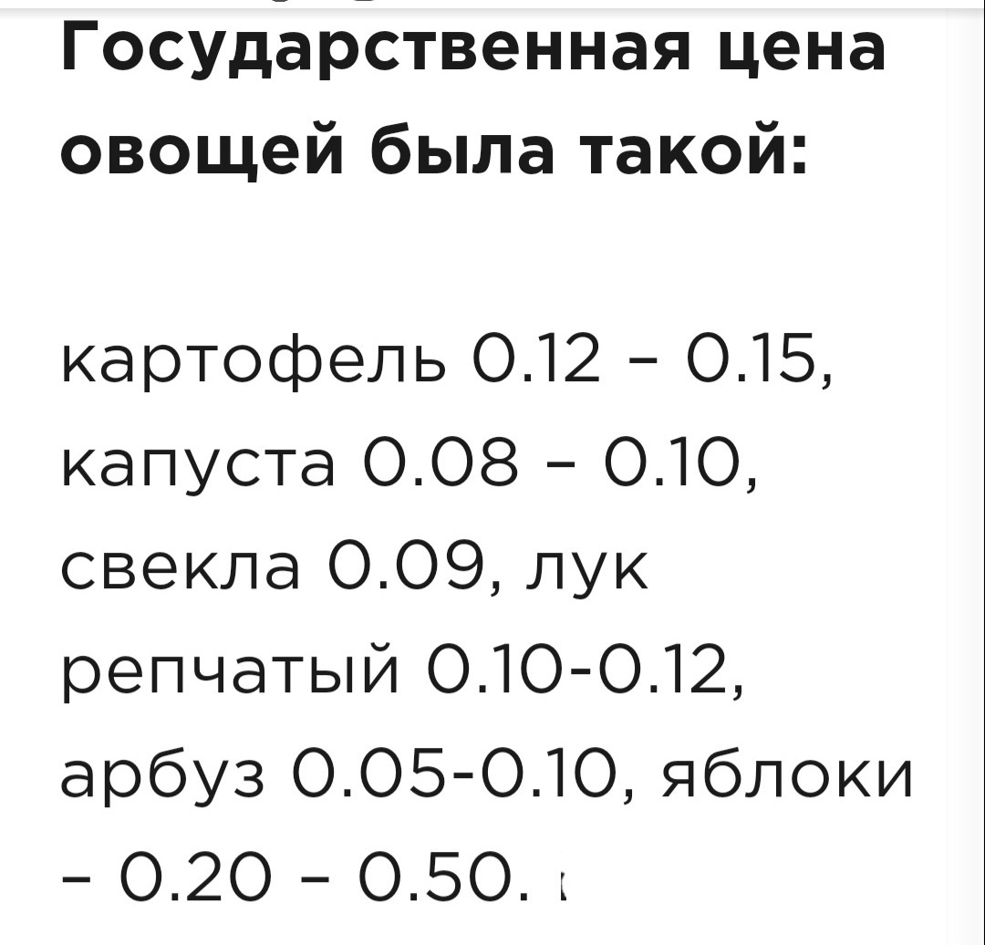 Михаил ,представьте такое было и ещё повторюсь ,я дала ответ автору ,для сравнение за свой край ,т к автор заявил ,что в наше время ,мы настолько боХаты при усреднённой з/п в 66 тыЩ ,что можем позволить себе чуть ли не полтонны помидор (бред,никто равно не зарабатывает,тем более выводить среднюю -абсурд ,в то время ,как в союзе на минималку ,можно было позволить больше помидор(будь они неладны