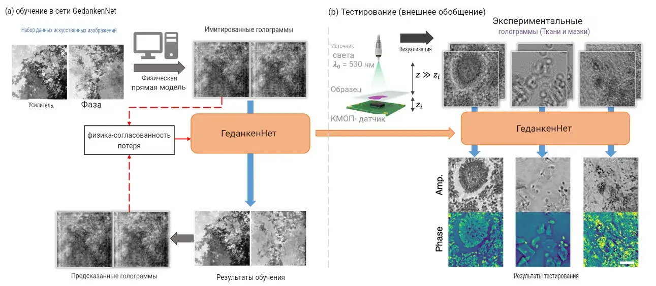 Опираясь только на законы физики, которые повсеместно управляют распространением электромагнитных волн в пространстве, исследователи научили свою модель ИИ восстанавливать микроскопические изображения, используя только случайные искусственные голограммы, синтезированные исключительно из "воображения", не полагаясь на какие-либо реальные эксперименты, фактическое сходство образцов или реальные данные.
