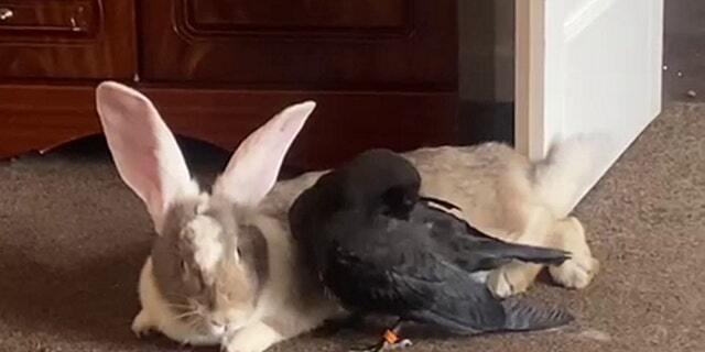Ворона была доставлена домой после того, как пара спасла ее с улицы. Птице понравились его соседи по дому: пять кроликов, принадлежащих паре. (СВНС)