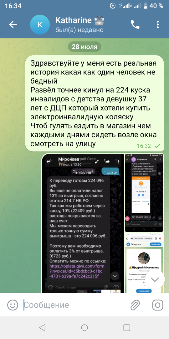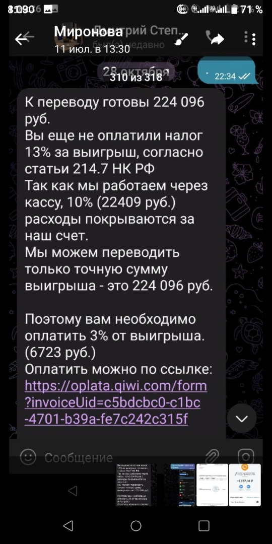 Вот его новый скрин сегодняшний 10 августа вот скрины нашего выигрыша оплаты четвёртый скрин - это выигрыш который для моей жены на покупку электроколяски инвалидный другие скрины это его второй сайт это потому как он перестал отвечать на этом я его нашёл другому отправил ему скрины написал что мы ждём мы оплатили ставку налог там и вот ничего не сказав он просто заблокировал в результате с ним связаться никак по видео видно что он всё видел что был налог скрины ему отправлялись в концовке так и ждём его выигрыша нашего оплаченного уже август десятое число Ну как видно ему этот выигрыш нужнее как и наша ставка налог который он запросил какая есть гарантия что этот налог ушёл в налоговую а не ему опять как и ставка и выигрыш который он тоже себе оставил и последние скрины справки что был оплата этого налога у при оплате налога у меня там суммы не хватало пришлось занять в общем оплатили и всё не вложенных не выигрыша ни ответа ни привета