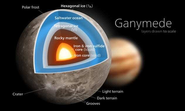 Еще на одном из спутников Юпитера может быть жизнь. Как и на других спутниках, на Ганимеде, как полагают, есть океан под его корой. Удивительно, но этот океан может содержать больше воды, чем сама Земля. Фактически, исследование поверхности Ганимеда показывает, что, возможно, однажды было наводнение, когда жидкая вода вытекла из-под поверхности через трещины или другие отверстия. Исследование этой Луны даже привело к появлению новых методов исследования. Например, анализируя магнитные поля, ученые обнаружили, что они, возможно, могут получить информацию о внутренней части объекта, в том числе о наличии жидкой воды.По состоянию на начало 2017 года миссии по исследованию Ганимеда не существует. Но зонд JUICE (JUpiter ICy moons Explorer) намерен продолжить исследование спутников Юпитера в ближайшие несколько лет.