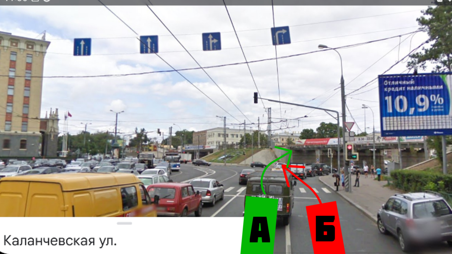 Привет! У знакомого было дтп на этом перекрёстке и его сделали виновным. Стояли на светофоре дожидаясь зеленого сигнал светофора, светофор загорелся и все поехали. Автомобиль знакомого это (А) ему нужно было ехать направо под мост, второй автомобиль (Б) газанул и решил поехать прямо. В итоге ДТП, автомобиль (Б) чирканул бочиной зеркало автомобиля (А). Вызвали гибдд, они приехали и сказали что нарушитель автомобиль (А). Вот вопрос кто виноват? Если у автомобиля (Б) знак направо, а он поехал прямо и создал ДТП. А у автомобиля (А) знак прямо и направо, он двигался по правилам направо🤔 Сотрудники гибдд сказали что здесь перекрёсток как круговое движение, но знаков кругового движения небыло.