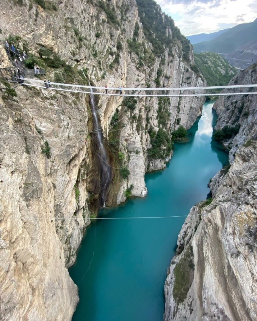 Пещеры соединены подвесным мостом, расположенным на высоте 60 м от протекающей по дну каньона бирюзовой реки Сулак. Виды с него и с близлежащих смотровых площадок потрясающие, а от красоты и остроты ощущений, когда идешь по мосту, захватывает дух.