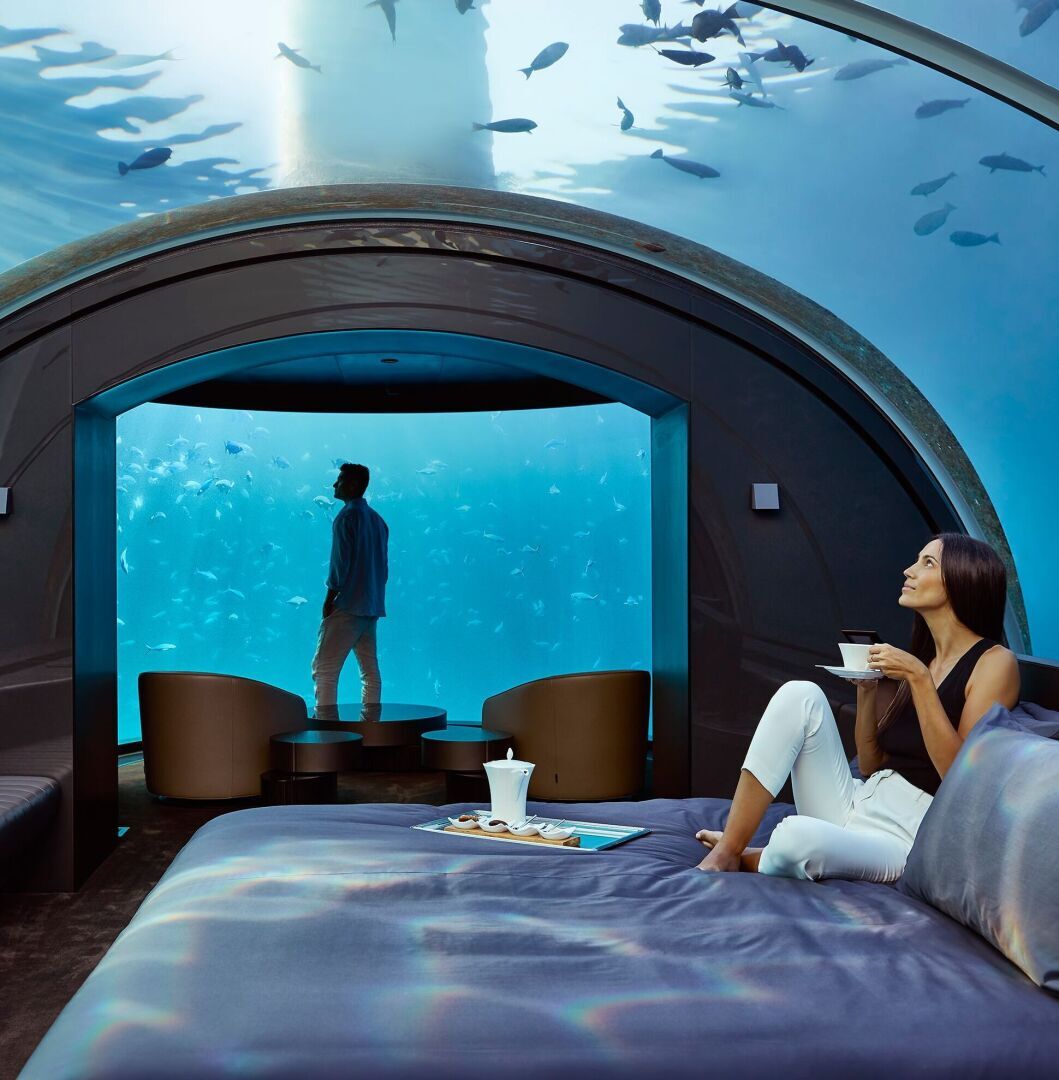Выходя за рамки обыденности, остров Конрад Мальдивы Рангали манит бесстрашных окунуться в незабываемые впечатления, как никто другой. Представьте себе это: вы, заключенный в стеклянный кокон, наблюдатель глубин, где потолок - ваш портал в водное царство, а стены шепчут истории о морском очаровании. Эти уникальные жилища, погруженные на глубину 5 метров под сверкающую поверхность, по-новому определяют роскошь.