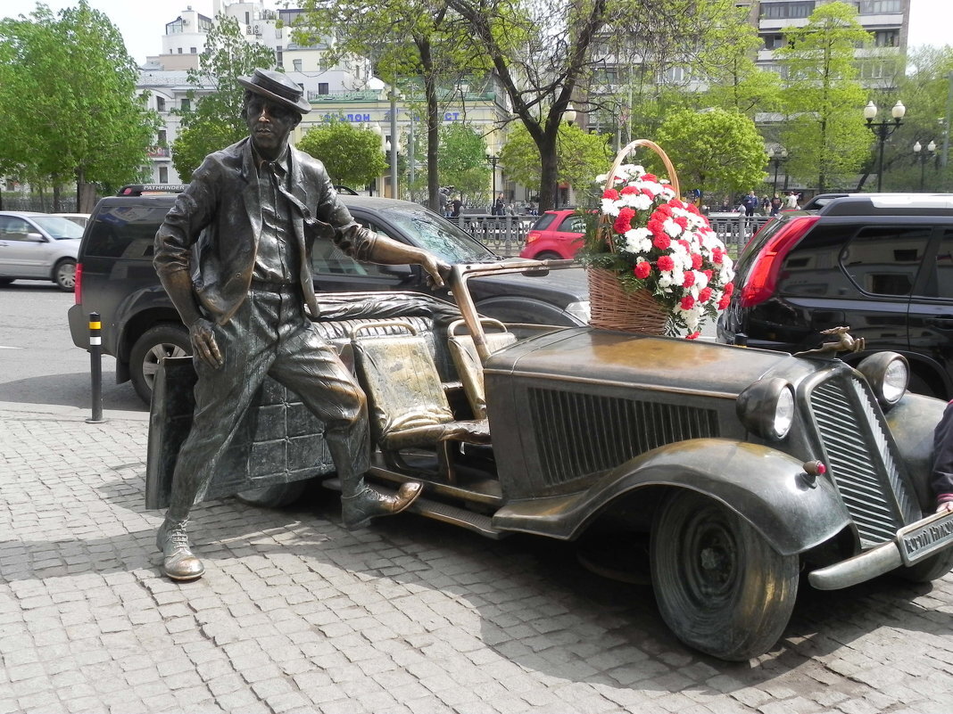 Скульптура Юрия Никулина с его легендарной цирковой машинкой