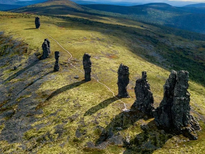 Маньпупунер, известный также как Столбы Выветривания, расположен на территории Печоро-Илычского заповедника в республике Коми. Это удивительное природное явление представляет собой семь отдельностоящих каменных столбов, возвышающихся на высоту 700 метров над уровнем моря. Самый низкий столб достигает 22 метров, а самый высокий — 50 метров.
