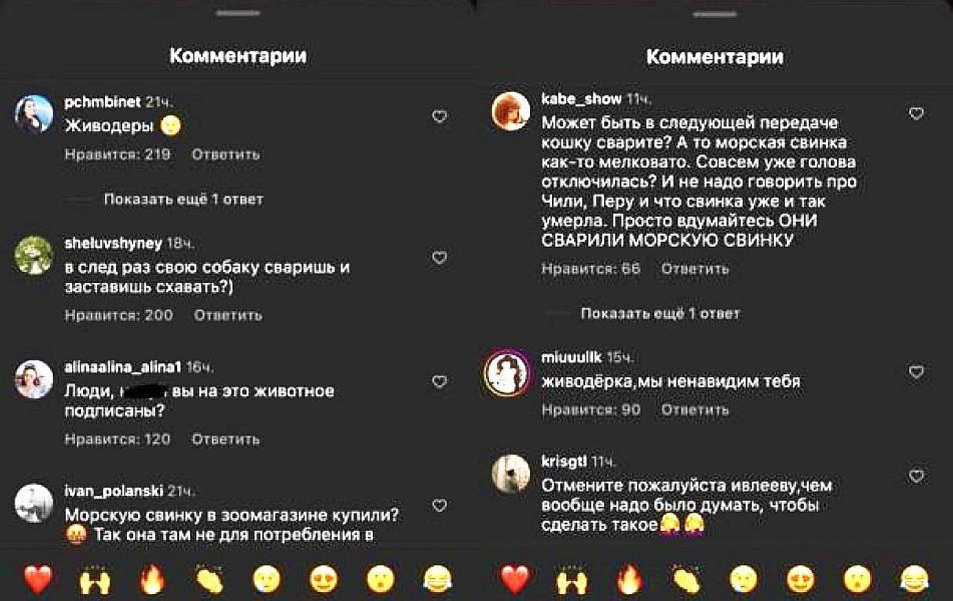 Реакция возмущённых зрителей на эту непотребную сцену была мгновенной и самым цензурным названием для весёлых дамочек стало слово «живодёрки». Люди требуют закрыть передачу Ивлеевой, оштрафовать её за жестокое обращение с животными, а саму Настю спрашивают, когда же она перейдёт на поедание собак и кошек?