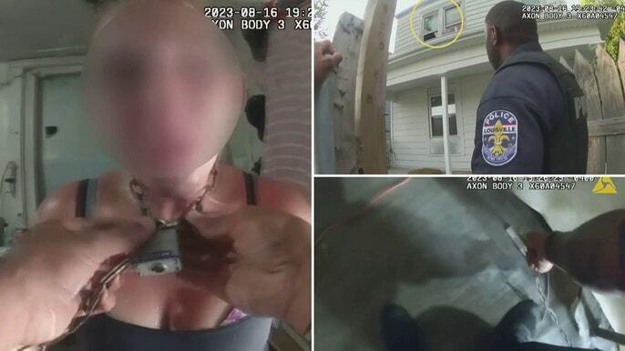 Полиция Луисвилля спасает пленную женщину, прикованную цепью к полу дома, на драматическом видео с телекамеры.
