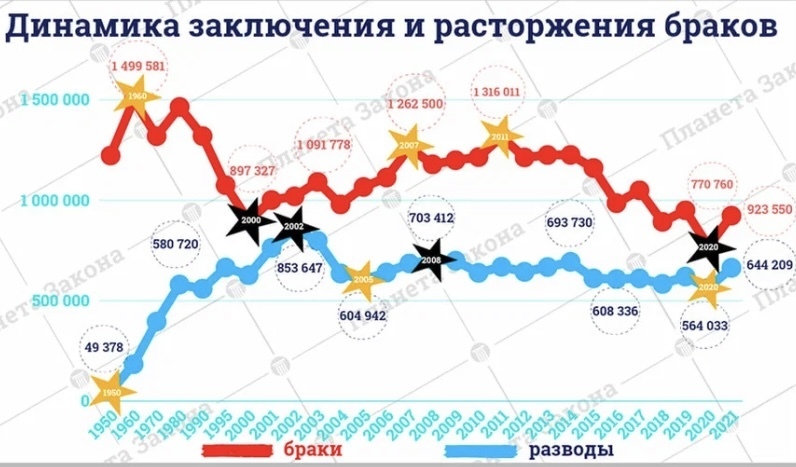 - В 2020 году в нашей стране было зафиксировано не боле 770 тысяч браков, но их расторжение в цифрах практически негативное - почти 565 тысяч;