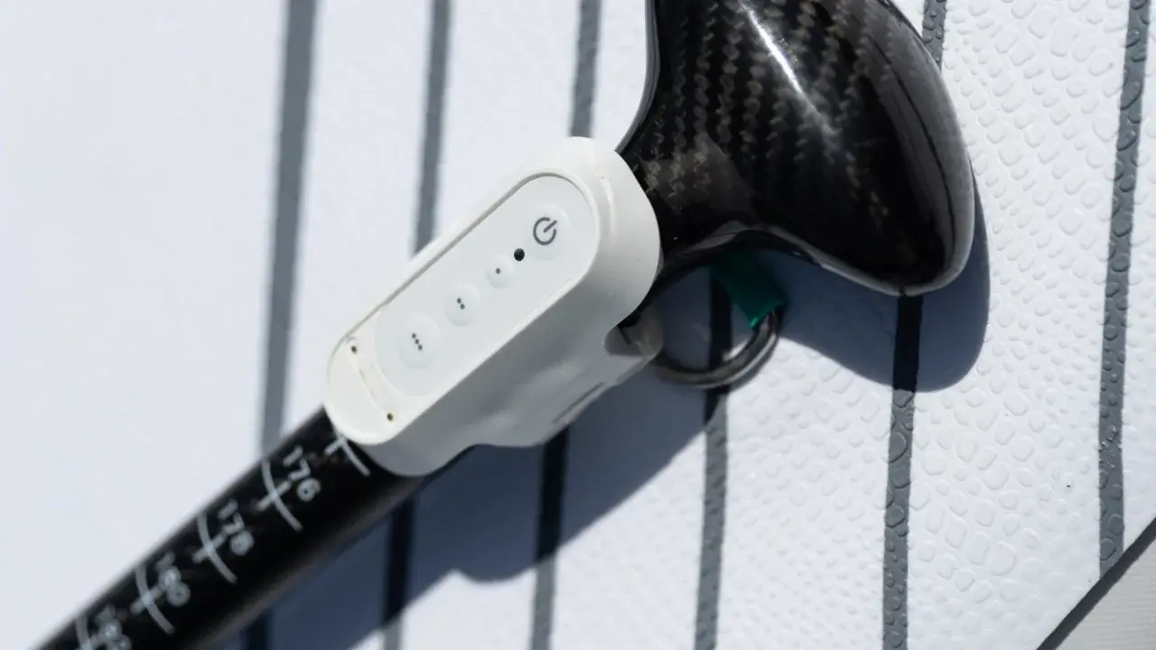 Плата также имеет встроенный компрессор, который накачивает ее одним нажатием кнопки, обеспечивая оптимальное давление за считанные минуты. Доска может развивать скорость до 4,3 миль в час на воде и оснащена интеллектуальным веслом Bluetooth, которое действует как пульт дистанционного управления для мотора.