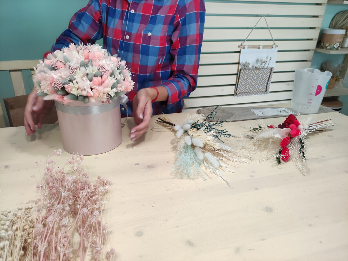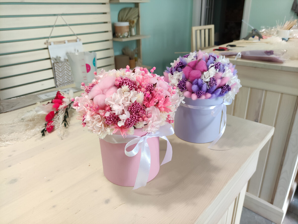 Благодаря замене жидкости в цветках и стеблях на глицерин и специальные добавки, зелень, цветы и сухоцветы не теряют своей красоты в течение целого и более. Если их не мочить, не выставлять на солнце, то композиция, собранная из таких цветов может стоять НЕ МЕНЕЕ года.