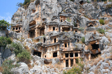 По верованиям древних ликийцев после смерти люди попадают на небо, и чем выше гробница, тем быстрее и проще ему добраться до нового пристанища. Простолюдинам же, погребенным на обычной земле, и вовсе путь на небеса был заказан - слишком долгий путь пришлось бы им преодолеть. По этой причине все богатые и знатные стремились обустроить захоронения как можно выше, для чего сооружали их прямо в скалах. Рабы прорубали в них целые усыпальницы, с виду напоминающие дворцы или святилища, настолько красивы и роскошны были их фасады. Чем-то ликийские гробницы Миры напоминают скальный город Петра, да и впечатления производят схожее – ощущение безмерного величия и восторга.