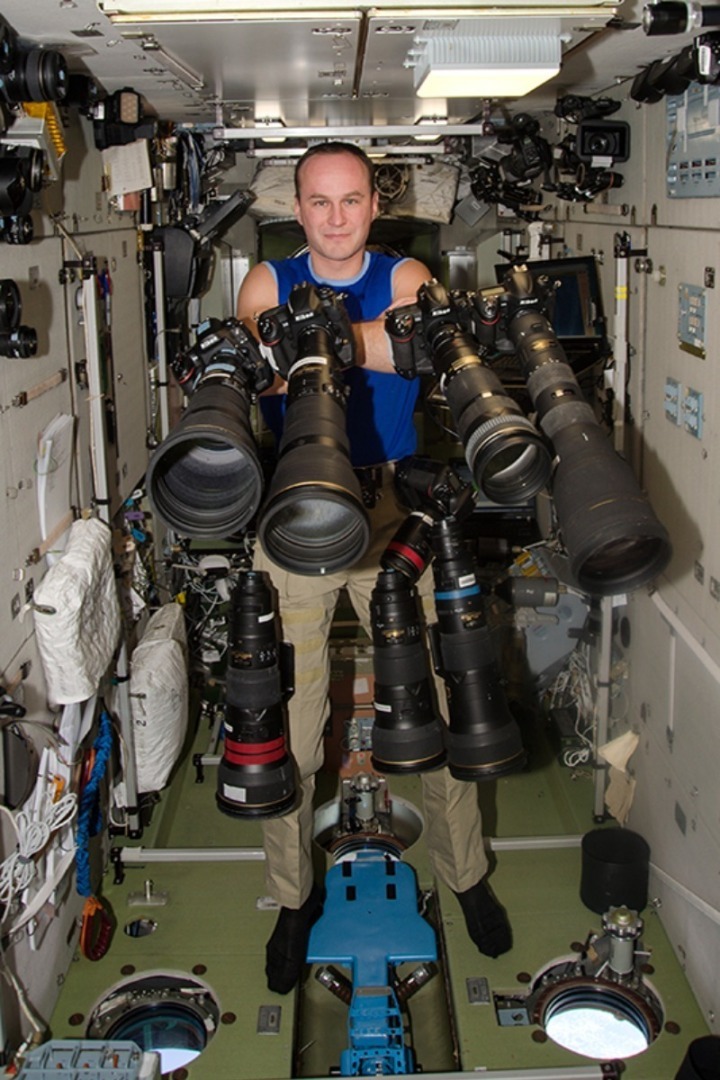 Обратите внимание на целый выводок фотоаппаратов с длиннофокусными объективами. Дело в том, что когда Рязанского спросили, на какую оптику космонавты снимают Землю, не на рыбий ли глаз, он ответил: никак нет, мы снимаем на длинный фокус - и показал все эти свои фотоаппараты. Но, тогда почему же тогда нам показывают фотки, сделанные на фиш ай (рыбий глаз)? Где же все эти фотки, сделанные на длиннофокусный объектив? Вы можете набрать в поиске "Земля из космоса", и вам система выдаст массу фотографий с закруглениями не только самой Земли (причем, величина закруглений от фотографии к фотографии бывает абсолютно разной), но и солнечных батарей МКС. Ну, вот, например: