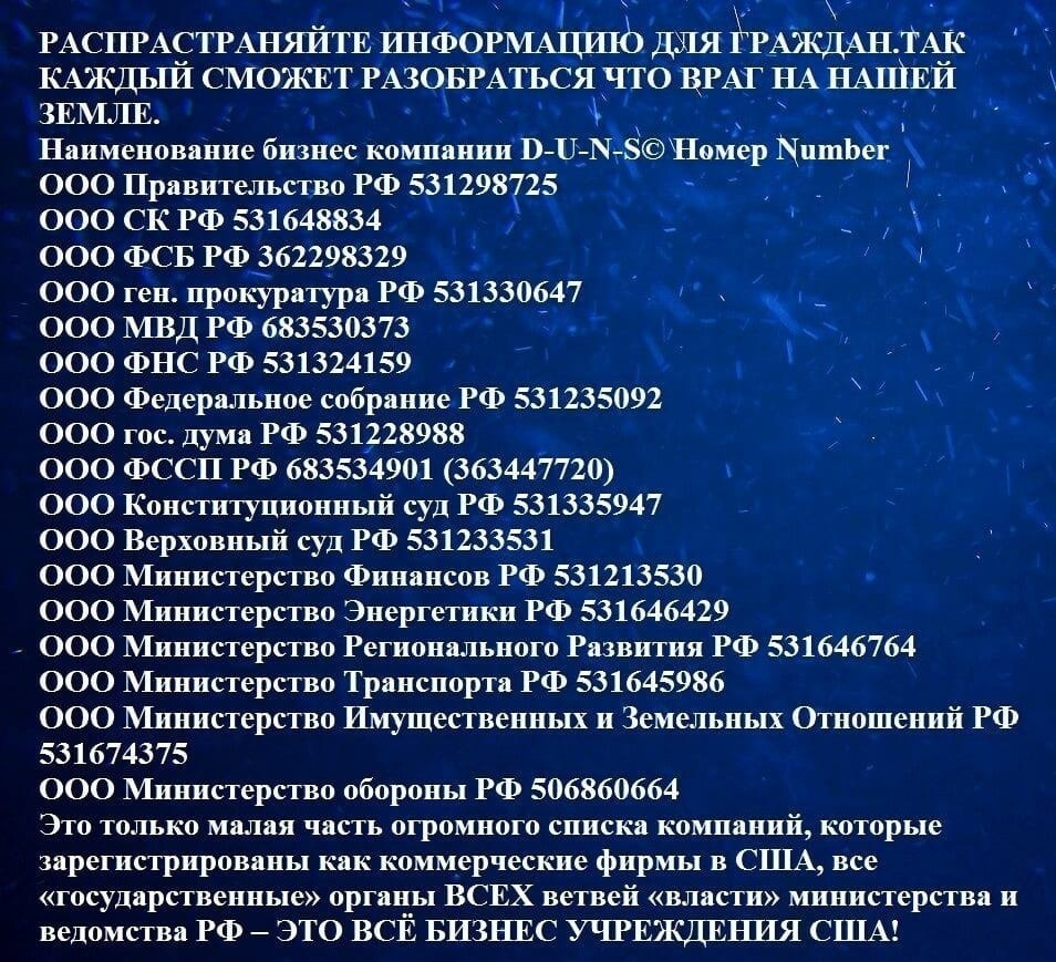 Поэтому нет конституции, нет граждан РФ, и вы не поверите - даже валюты своей у РФ тоже нет. Есть ББР - билеты банка России, которые валютой не являются. Они просто считаются средством платежа. Мы все живем в выморочной стране, в королевстве кривых зеркал, поэтому нас каждодневно и грабят, но таким как вы на все нас рать с высокой колокольни. Мы живем в самой богатой ресурсами на Земле стране, а народ живет в нищете и бедности, зато кто-то по миллиону в день зарабатывает. Продолжайте верить, что наше государство РФ и у нас все хорошо.