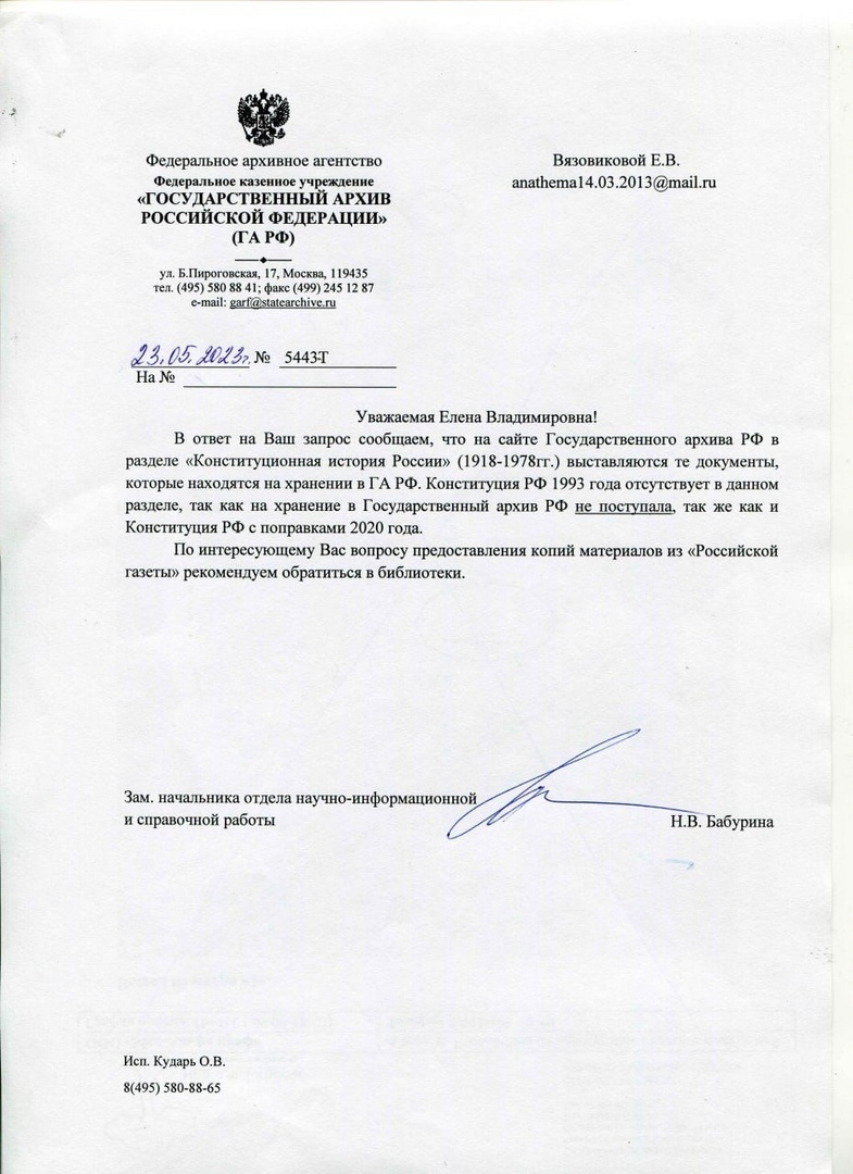 5. В Архив сдаются документы которые потеряли свою актуальность и подлежат хранению. А Конституция РФ действующий документ. К тому же внимательно прочитайте само письмо из Госархива, Конституция была принята в 1993г. А у Вас в ответе числится раздел 1918-1978г.